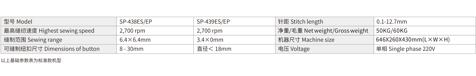 SP-438ES适⽤于各种⾐物平扣缝制、缝制纽扣外径尺⼨为8-30mm、纽扣的缝制区域为、6.4-6.4mm SP-439ES⽤于装钉各种⽴扣、⽴扣的缝制区域为3.4mmx0mm
