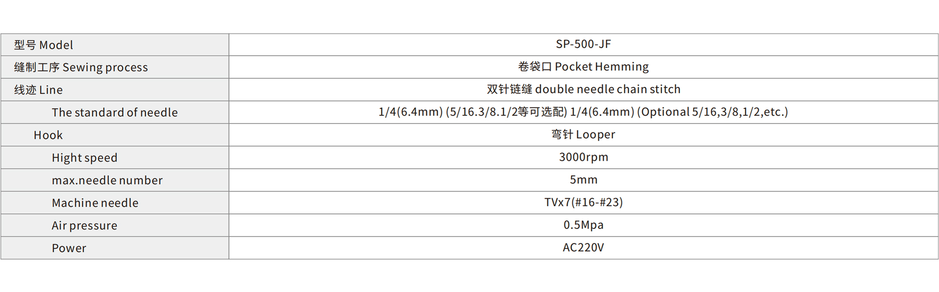 适⽤于各种厚薄布料及不同尺⼨的袋⼝⻋缝,⽆需任何调整,卷折、⻋缝, 收料⼀次完成。