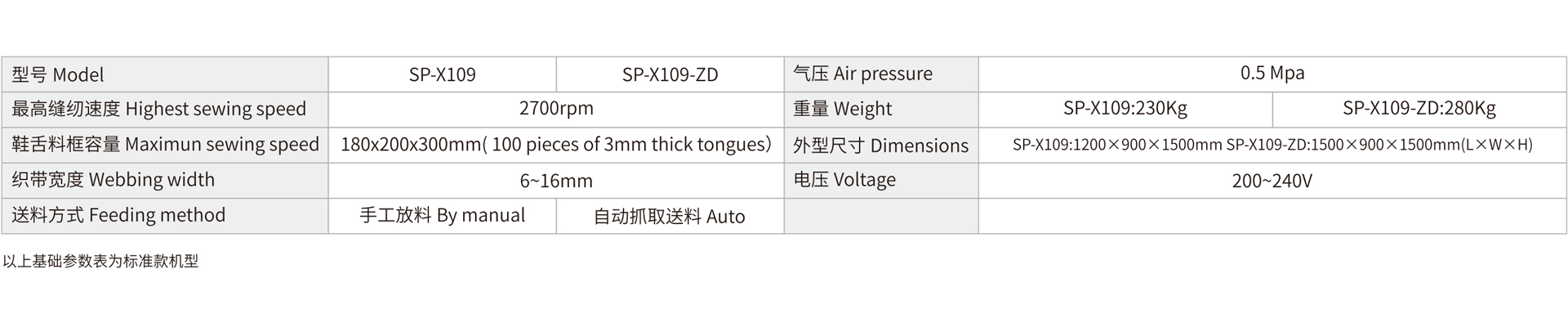 SP-X109-ZD 操作工:1人多台,循环缝制时间7.8秒/鞋舌SP-X109 操作工:1人1台,循环缝制时间9秒/鞋舌